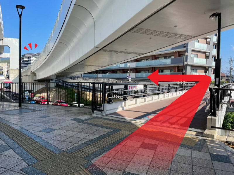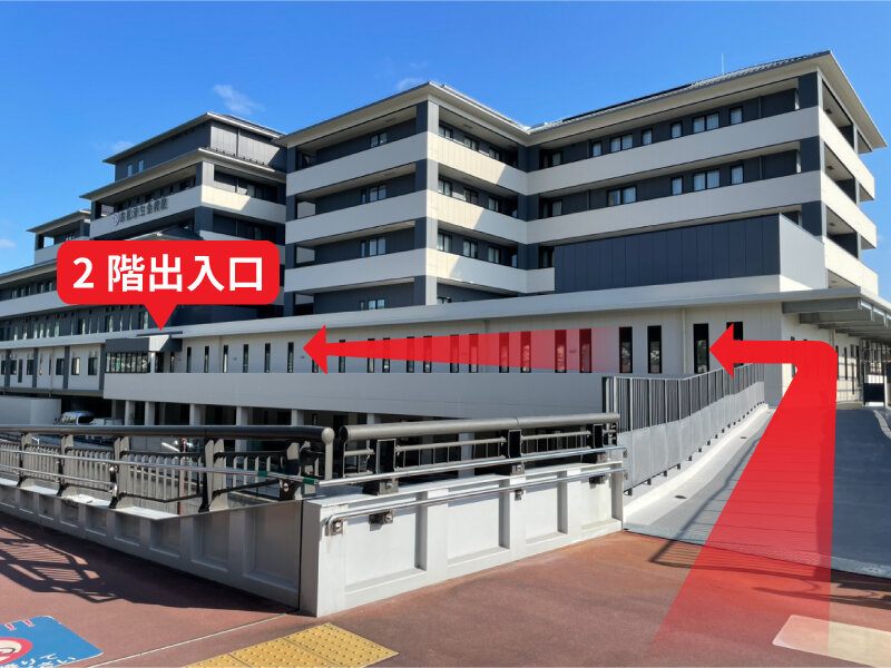 (7)病院手前で右に進み、左に折れて建物に沿って進む。2階出入口に到着