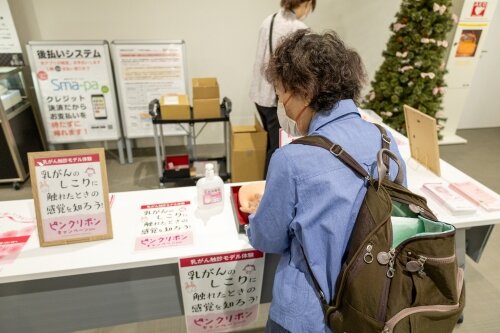乳がんモデルの触診体験ではがんのしこりの感触に多くの方が関心を寄せ、21日にはワコールによる相談・採寸会も実施しました。