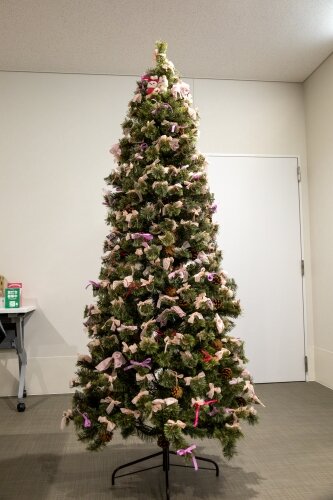 「ピンクリボンツリー」には大切な人の健康を願い約300名がピンクリボンを結びました。このリボンはワコールの提供で、下着製作の際の端材を再利用したものです。