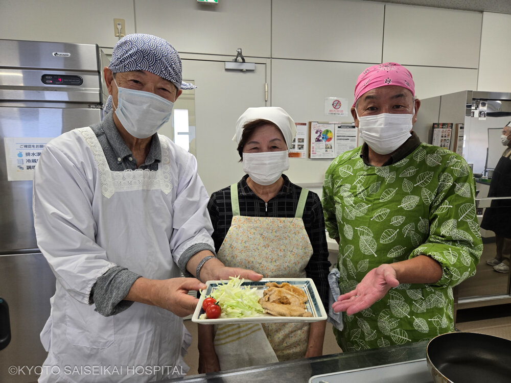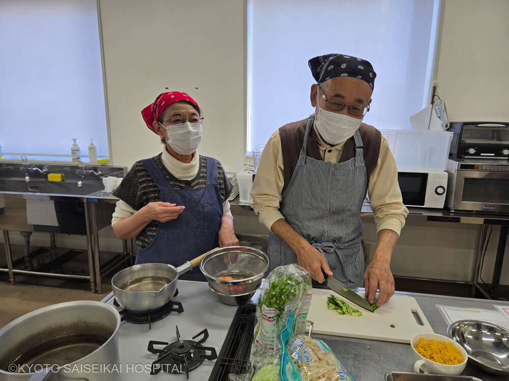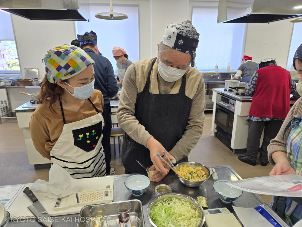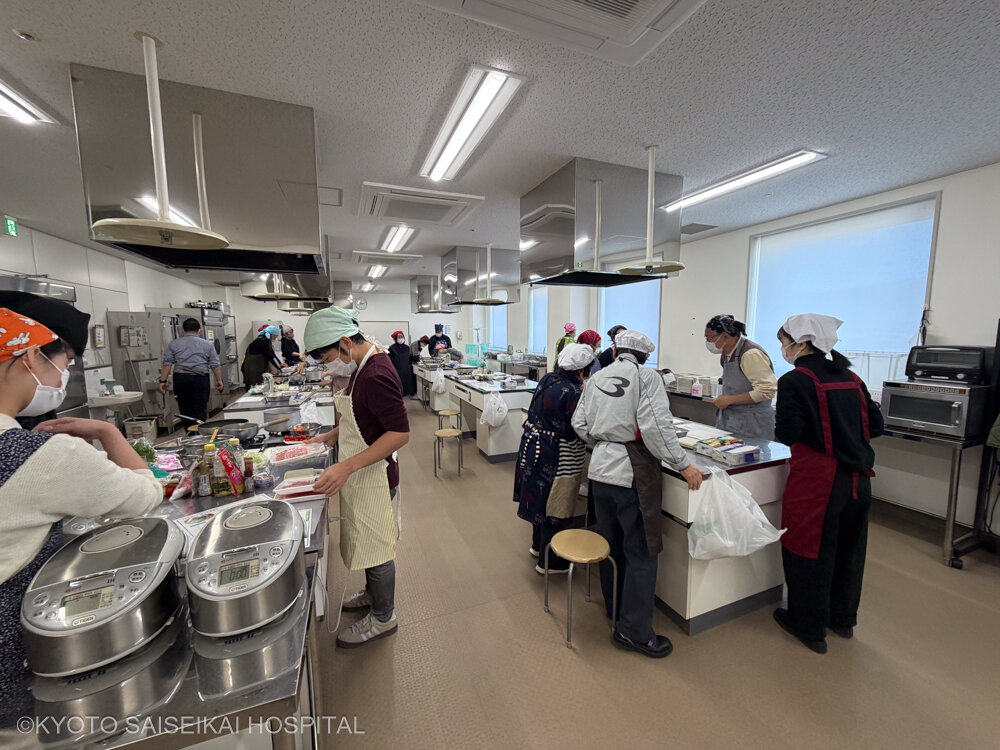 料理教室は、長岡京駅前施設(バンビオ)内の調理室で開催しました。当日は14 名が参加し、CKD チームと栄養科で楽しい時間を過ごすことができました。男性の参加者が8 名と多く、かわいい割烹着姿も披露してくださりました。時間通りに終われるかと心配していましたが、普段から料理をされている方がほとんどで手際がよく、順調に調理が進みました。調理後は、自ら作っていただいた料理を試食しながら、減塩のポイントを説明し、参加者からの質問にお答えするなど、盛り上がりました。