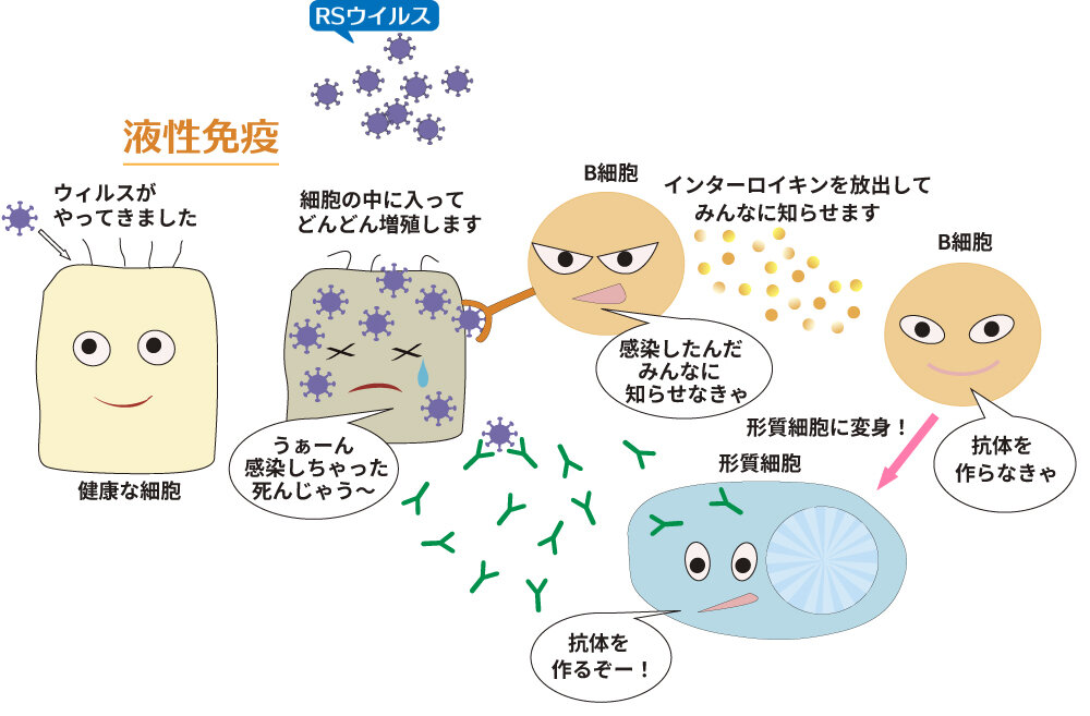 そこで体に入ってきた病原体にどのような特徴があるかを白血球が認識してその情報をB細胞と呼ばれるリンパ球に伝達し、B細胞は病原体に対する抗体(いわゆる武器です) を大量に作ります。これによってウイルスが制圧されます。(液性免疫)