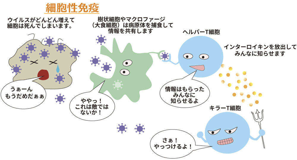 異物が侵入した場合真っ先に樹状細胞やマクロファージが捕食してヘルパーT細胞に情報を送ります。ヘルパーT細胞はインターロイキンなどの物質を放出してキラーT細胞に指令を出します。指令をうけたキラーT細胞は異物と同時に感染した細胞もやっつけに行きます。