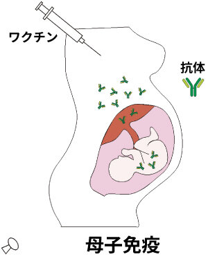 妊娠24週~36週の間にお母さんにワクチンを接種すると2週間以降には赤ちゃんを守る上で十分な量の抗体が作られ、できた抗体は血液に乗って胎盤を通って赤ちゃんに供給されます。この抗体は生後6カ月まで赤ちゃんを守ります。